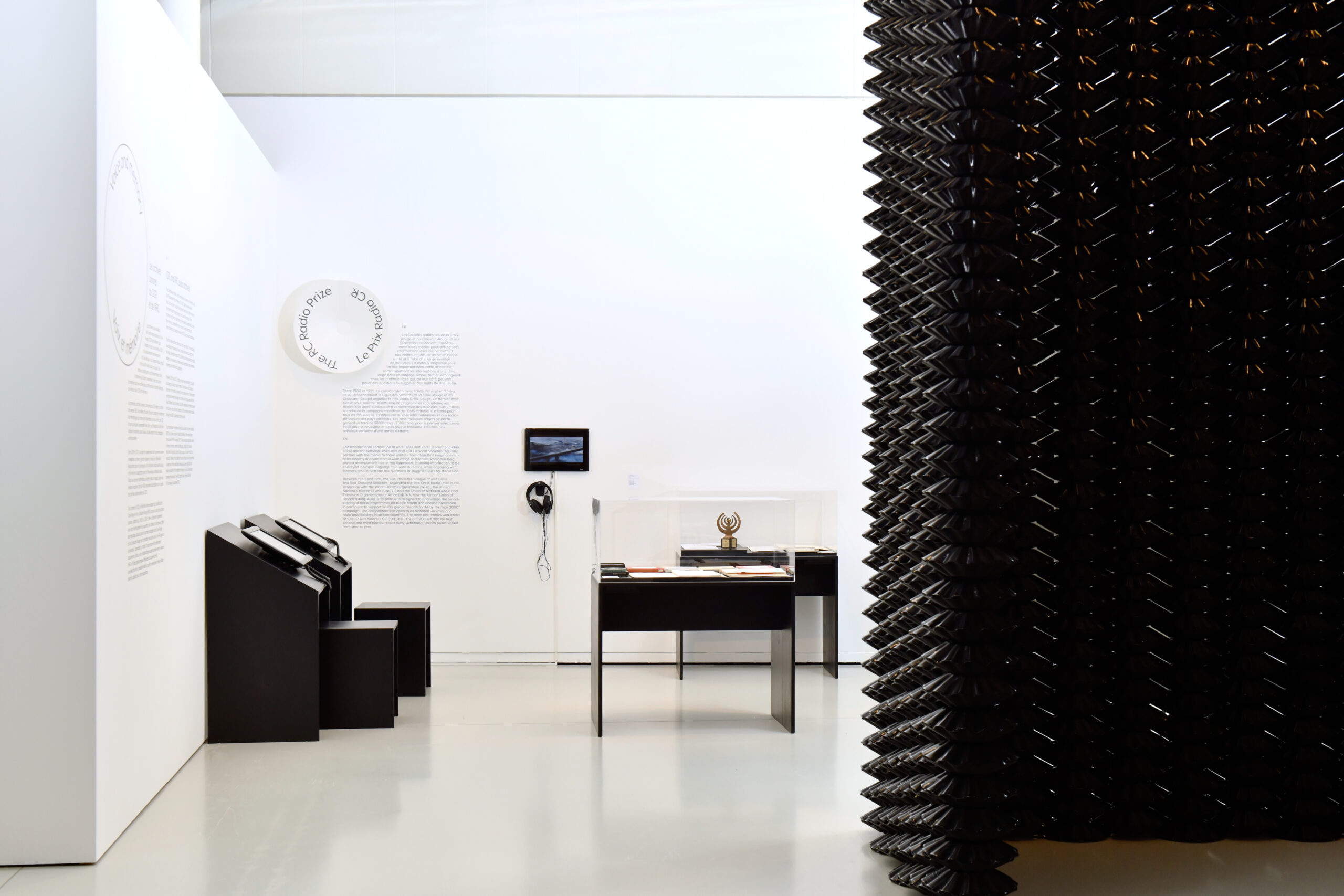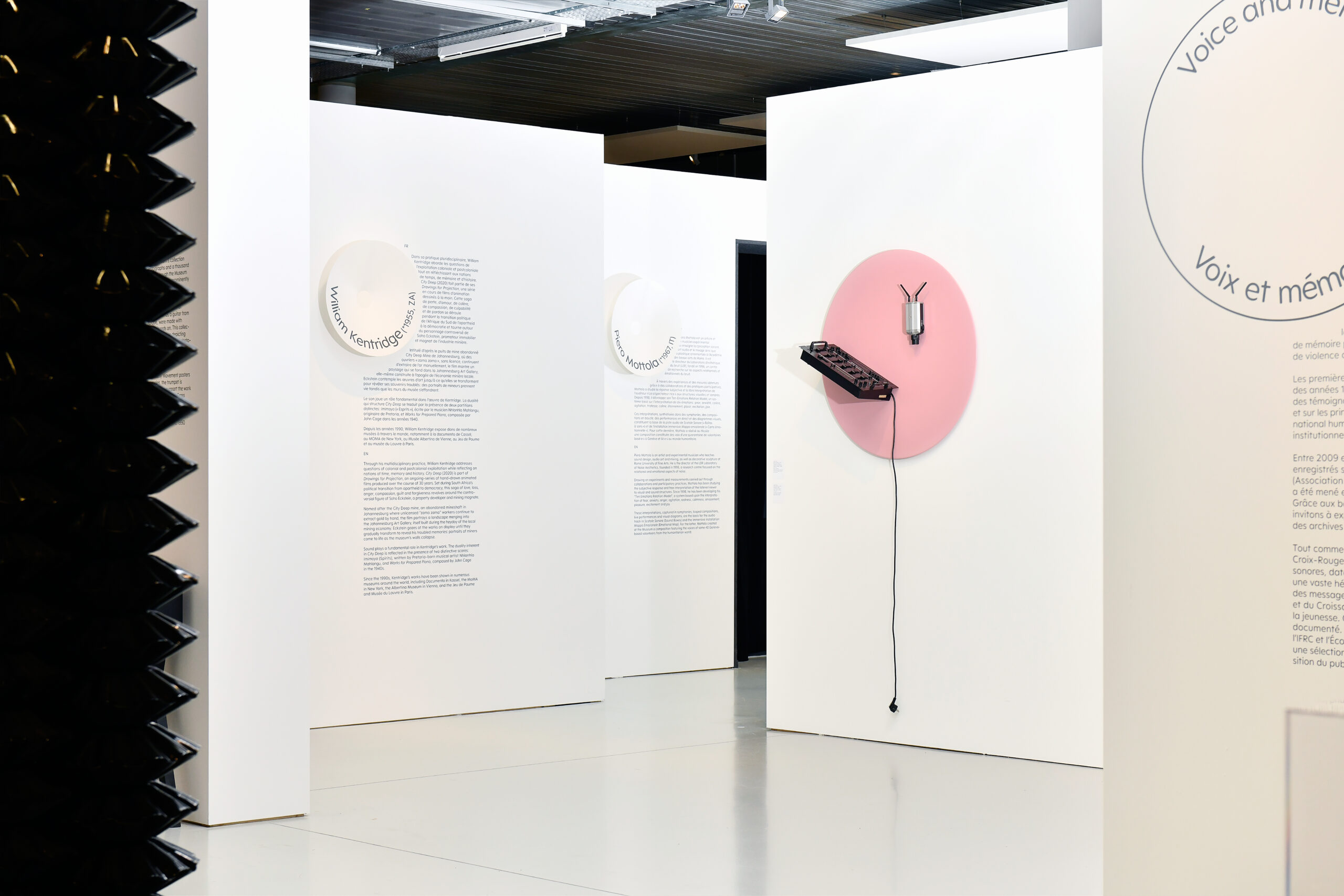 Bandes sonores et enregistrements d’époque, affiches, photographies et objets de prisonnier·ères y côtoient des œuvres d’art historiques et de nouvelles productions de Manal AlDowayan, Betty Danon, Marco Donnarumma, Gregor Hildebrandt, William Kentridge, Christine Sun Kim et Thomas Mader, Piero Mottola, Julia Scher et Dana Whabira. L’exposition entend redécouvrir les archives sonores du CICR, ainsi que celles de la FICR, avec des perspectives décoloniales, féministes et inclusives, afin d’aboutir à une constellation de relations entre le son, les archives et l’action humanitaire.